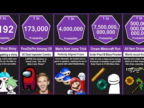 We compare the odds of people actually getting certain lucky elements in gaming speedruns, to the odds of getting a perfect run obtaining every item in 1 try. We look at games including Minecraft, Pokemon, Among Us and Mario Kart, and popular streamers which events actually happened to them. Music: "Neon Laser Horizon by Kevin MacLeod Link: https://incompetech.filmmusic.io/song/7015-neon-laser-horizon License: https://filmmusic.io/standard-license" Note: Probability calculated based on the cited streamer's video description and may be susceptible to biasness, else calculated using arbitrary odds stated in the description, and may have wide margin of error. Numbers at that scale pretty much has zero odds anyways. This video merely lists the odds and does not imply legitimacy or fraud. When there are millions of people playing, improbable events are bound to happen to the some people.
