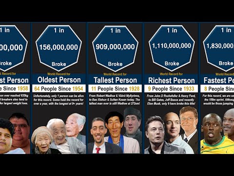From Elon Musk to Jeff Bezos, how many people have been the richest person alive? What is your odds and probability of becoming the richest person on earth? What about the heaviest person on earth? The oldest person on earth? What about breaking any other records in various categories? A gaming world record? A food world record? A juggling world record? The furthest, or longest world record? We list, compare and analyse all the popular records and see which ones you might break. If you cannot break any individual world record, we will give you the odds of being part of a group of people breaking the world record in events such as most number of people hugging, most number of people jumping or most people in a concert! Disclaimer: This video is not official, nor affliated with Guinness World Records, or Record Setters. It is purely fan made based on publicly available and searchable information from both databases. Numbers may have wide margin of error due to the different record adjudicators - e.g. between Guinness and FIBA for basketball records, as well making no distinction between individual records, group records, previous records or individuals with multiple records (the number listed arbitarily assumes all evens out). The 1 in xxx refers to out of a total population of 10 billion (from 1930s to now). Heptagons are not scaled for this vid. Information is as of January 2021 and may change when you watch this video. Music: Intense Suspense by Jason Shaw (Audionautix.com - CC4.0) Images Use: The Noun Project Individual Sources: https://pastebin.com/Ye436cAs List of World Records: Richest Person Alive, Tallest Person Alive, Fastest Person Alive, Heaviest Person Alive, Oldest Person Alive, Most Bunny Hops on a bike, Most Shirts Worn, Hula Hoop World Record, Most Coins Spin, Most squats in a minute, Most stairs climbed in a single jump, Most mouse clicks in a minute, Longest wall sit, Fastest Beer Mile, Human Flag World Record, Longest Plank, Dabbing world record, Longest painting, Heaviest weight lift, Fastest catcher, Longest handstand, Furthest throw world record, Longest rap world record, and many more including tallest card structure, most balls juggled, largest number of people hugging, largest concert, largest event ever.